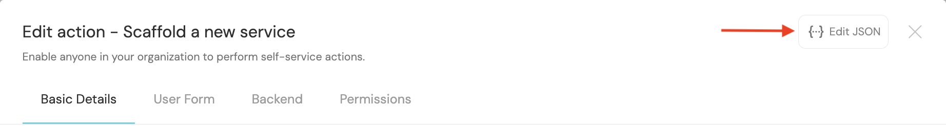 This is the action's permission configuration in JSON format. Every action in Port has the following two keys under it: