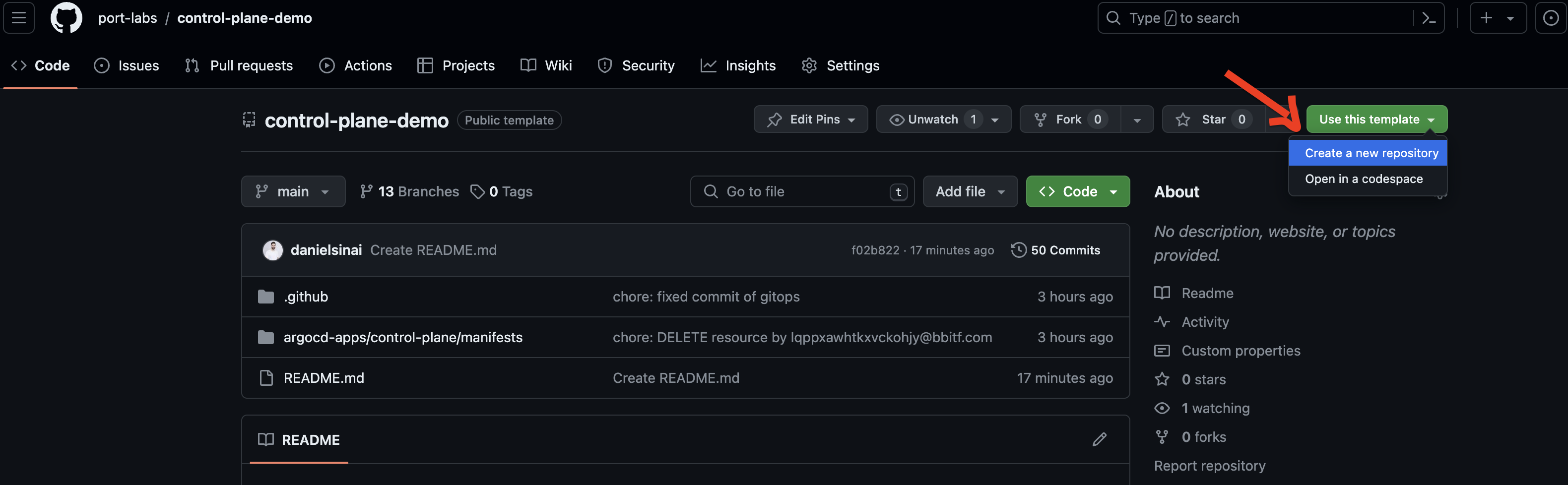 1. Go to the GitHub control plane example repo and use it as a template to create your own repo by clicking on the Use this template button.