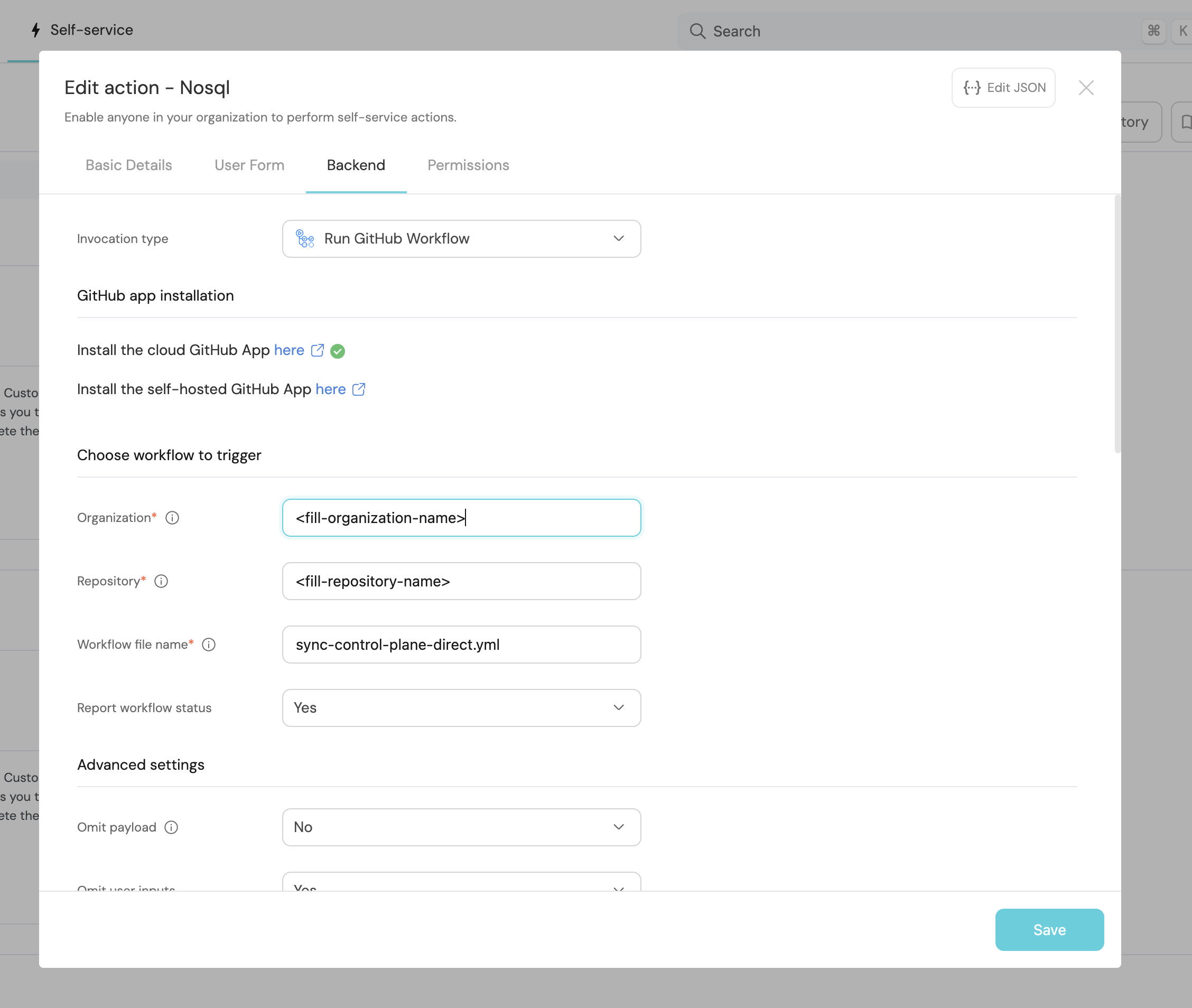 Now, to execute the action we need to add some workflow to it for Port to trigger the action, the workflow that we will configure will do the operations in the Kubernetes cluster using the kubeconfig that we will provide as a secret in the GitHub repository.