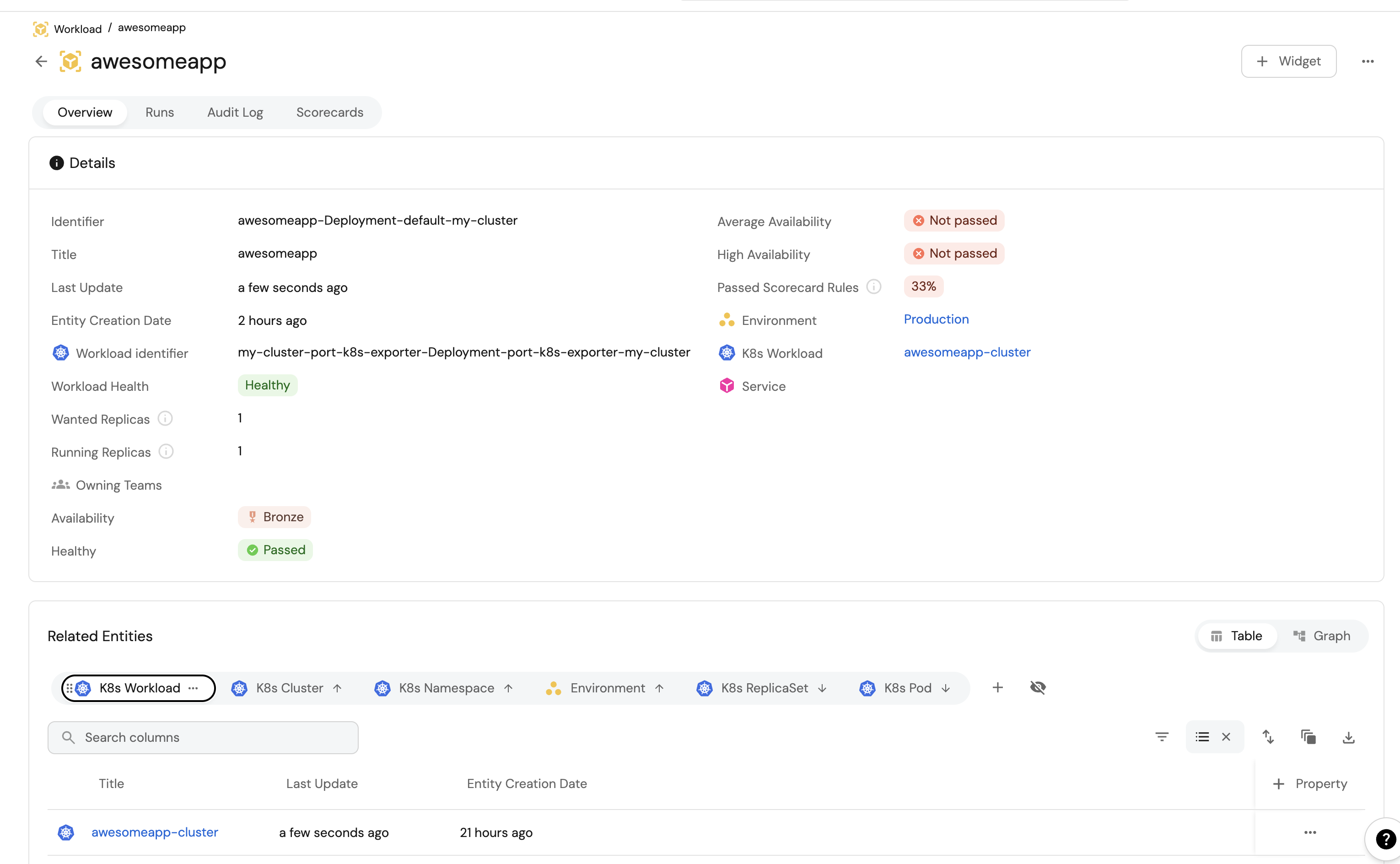 1. Create a Deployment resource in your cluster with a label matching the identifier of a Workload in your Software catalog.